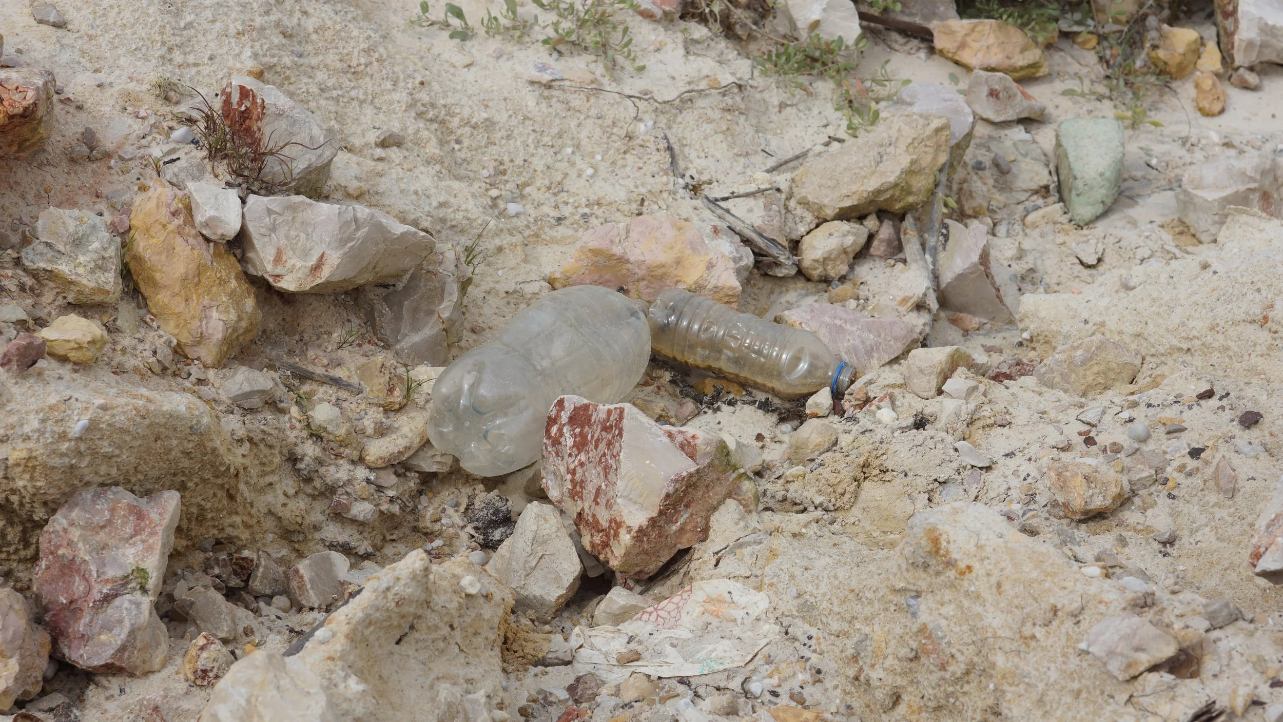 Plastic waste and rocks in the Companhia União Fabril (CUF) industrial park in Barreiro, Portugal (2025)